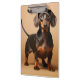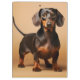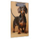 This portrait of a Dachshund dog, presented with a high degree of realism, shows the dog positioned front and center, with bright, expressive eyes that are accentuated by the dog's tan markings. Its coat is glossy and sleek, with shades of rich chocolate brown and tan. The Dachshund's ears are characteristically long and droopy, framing its face with a soft elegance. The tail is aloft with a slight curve, indicating a state of alertness or curiosity. The background is a warm, neutral tone that complements the dog's coat and highlights its outline without distraction. The lighting on the dog is soft yet precise, casting subtle shadows that emphasize its muscular build and the unique, elongated shape typical of the breed. generativecontent