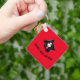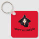 The front of the keychain shows the portrait of a young witch with long black hair and a black pointed hat on a red background, together with the words "Happy Halloween!". The keychain can be easily personalised.