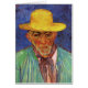 Portrait of Patience Escalier, Shepherd in Provence by Vincent van Gogh is a vintage fine art post impressionism daily life portrait painting featuring an old man, a local peasant farmer from Provence in the south of France. This elderly gentleman has a beard and a moustache and is wearing a yellow straw hat, suit and tie with a beautiful bright blue background.