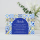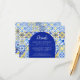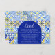 This rustic design features a background pattern of blue, yellow and white watercolor Portuguese tiles, or azulejos. The word "Details" appears in elegant white script on a blue arch shape. Personalise the card with information for your guests in white copperplate font. A matching tile pattern appears on the reverse side.