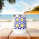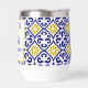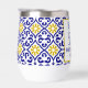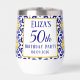 Portuguese tiles, blue, white and yellow pattern, rustic Azulejo, Mediterranean 50th Birthday wine tumbler. Personalise it with your details.