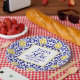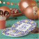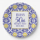 Portuguese tiles, blue, white and yellow pattern, rustic Azulejo, Mediterranean 50th Birthday party plate. Personalise it with your details.