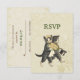 Fun wedding RSVP card. Sweet vintage bride cat holds a white rose wedding bouquet and Groom cat struts beside her with his black top hat. Ivory floral background. Customise text on back.