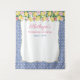 Fabric backdrop with watercolor lemons / leaves / pink flowers against a blue and white vintage tile border. I have invitations and other stationery in the same design (please see collection).