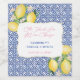 Stylish wine bottle label design with vintage blue and white tile pattern and watercolor lemons.