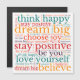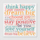 Colourful Typography of uplifting phrases to send someone with this WordArt pattern in multicolors of red, yellow, orange, teal and purple with the motivational quotes, Believe, Choose joy, Think Happy, Dream Big, Stay Positive, Love Yourself and Be You, on a white background.