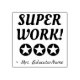 This inspirational rubber stamp design features the encouraging message "SUPER WORK!" and a personalised teacher's or educator's name. It also features a decorative star shape. It could be used by a teacher, educator, instructor, or tutor when marking assignments, to indicate that the student has done a great job.
