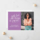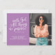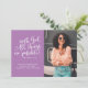 A modern Christian graduation announcement card, featuring the Bible verse Matthew 19:26 "With God all things are possible" in white modern script font, on a lilac background that can be edited by clicking 'customise further', next to a photo of the graduate. Personalise with graduation details in white sans serif font.