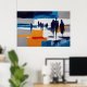 Loose, confident brushstrokes and geometric colour fields give the piece a modern, painterly structure. The figures appear anonymous and universal, emphasising shared experience rather than individuality. There is a sense of transition in the scene—between weather and calm, movement and pause—making the artwork emotionally resonant and quietly powerful.