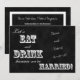 This post wedding reception invitation features a black and white chalkboard design with the words "Let's EAT and DRINK because we're MARRIED!" on the front along with a place for you to "write" your names at a slant on the chalkboard, along with the date of your marriage. On the back of the post wedding reception invitation are the pre-wedding names of the bride and groom and where they were married along with the details for the post wedding reception. A modern and fun way to invite your guests to a post wedding reception. Copyright henishouseofpaper