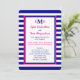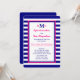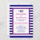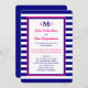 This post wedding reception invitation features a nautical theme in hot pink, navy blue and white. The invitation details are printed in hot pink and navy on a white background with navy blue and pink edging with a navy blue and white stripe background. Your monograms are placed prominently at the top with your last name monogram and individual first initial monograms. This is a great nautical theme stripe post wedding reception invitation. Copyright henishouseofpaper