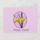 Yellow daffodils emerge in front of oval "window" with purple trim. Background in light lavender, interior of oval a darker shade. Text beneath reads "Happy Easter!" and my be customised.