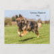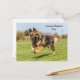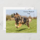 Postcard featuring a running bouncing happy German Shepherd Dog Alsatian. He is very cute, beautiful, fluffy and cuddly. He is a dark sable coloured long haired dog.