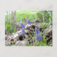 Grape Hyacinth, small purple clusters on green stalk, from genus Muscari, also called “starch lilies,” “lent flowers,” or “church steeples.” These specimens are nestled in fallen leaves among the grass.
