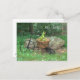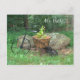 Hi there is written in white script. Pretty pink flowers in small old-fashioned black garden bicycle in the grass with boulder rocks and trees in the background. NOTE: Go to Paper Type and Select Semi Gloss Postcards before checking out. Original Photography by TamiraZDesigns.