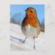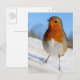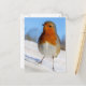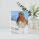 Postcard featuring a European Robin (Erithacus rubecula) stood on snow, his bright orange red breast vivid in the sunshine. A cute christmas image suitable for any British garden bird or wildlife lover.