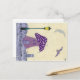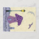 Fanciful postcard with purple polka-dotted mushroom house, lamp post, crescent moon, cat, musical score, and flying bird.