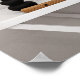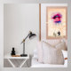 A modern bedroom features a white nightstand with a black lamp and decorative objects, next to a bed with patterned pillows. A framed picture depicting vibrant lips and two seated individuals adds a splash of colour to the minimalist decor. A fun picture within a picture.