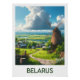Countryside illustration of Belarus showing a rural village with wooden houses, a flower-lined path, and an old windmill against a backdrop of green farmland. An authentic poster for rustic and peaceful wall decor.