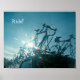 Bikes silhouettes are backlit with sun rays that scatter in prism colours. Bikes are attached to roof of van with rays of sunbeams shining through the spokes. In upper left corner the text "Ride!" in white.