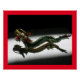 Dragon standing in white spotlight, with black background at the top and bottom. Dragon with green and white scales on body, gold and red spines on head, red tongue. Shadow below the body. Red trim at edges of poster.