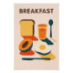 🖼️ Composition Isolated breakfast items such as icons: toast slice, fried egg, juice glass, small spoon Set in a tight plane, each on its own geometric base with long shadow drop Composition almost museal: each item highlighted in a morning light 🎨 Palette Fond cream or pale pink Objects in burnt orange, midnight blue, yellow, brown toasted Soft but sharp contrasts, soft effect 🔠 "BREAKFAST" Typography at the top, centered and spaced, in capital, modern minimalist style Color matching shadows (e.g. dark brown) 🧱 Graphic Style Extreme stylized objects, simplified but immediately recognizable Shadows, soft edges, false stylized volume Texture fine grain on background or objects for a soft effect ✨ Ambiance Spuré, design, almost sculptural Makes everyday objects noble and poetic, like modern artifacts