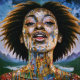"Golden Soul, Infinite Skies". A radiant Afro-modern woman surrounded by golden and cosmic details symbolises strength and spiritual transcendence. Blending abstract and surreal elements, this piece exudes inspiration and positivity, with the woman's smile representing hope, and inner strength for a brighter, united tomorrow.
