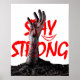 This powerful design shows a hand rising from the darkness with the words Stay Strong in bold red typography.