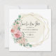 An elegant way to let friends and family know you have rescheduled your wedding. A gold geographic frame surrounds your wedding date details. The soft beige background highlights the text. Save Our New Date is written in a modern script, with details following. Pink roses and hydrangea flowers are nestled in green foliage leaves decorate the geometric gold frame. The save our new date card back is beige.
