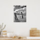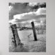 "Posts in the Snow" poster is an image of two wooden posts in the snow with thick fluffy clouds on a sunny day in the background. Done in black and white.