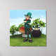 3D digital render of a leprechaun standing near a pot of gold, a mushroom and shamrock plants. Perfect St Patricks day gift