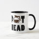 Funny coffee mug that says: Pot Head. The pothead pun design is a double-entendre word that leads us to believe that the owner of the mug is a recreational drugs lover, or a coffee lover. Or both...