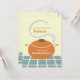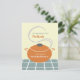 A potluck party invitation featuring an illustration of an orange cooking pot with handles and lid. Pot is sitting on a blue and white surface and has steam coming from under the lid. Personalise the text on front and back. Back features blue surface image at bottom.
