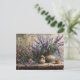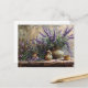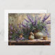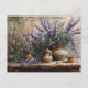A beautiful scene of lavender placed in earthen pots. The painting gives a rustic garden vibe. This beautiful botanical oil painting artwork would be an excellent addition to a postcard collection, used for scrapbooking, or other craft projects.