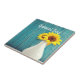 Potted sunflowers over a rustic weathered wood plank painted in sea glass blue.