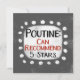 A funny typographic design that says "Poutine: Can Recommend, 5 Stars". It's black and red text on a white rectangle with funky, playful white dots surrounding it, all on a grey background.