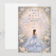 This elegant quinceañera design features a soft powder blue watercolor background framed by delicate ivory roses, subtle greenery, and ornate gold detailing, with a graceful gown illustration creating a refined, fairytale-inspired atmosphere. The cool blue palette paired with romantic florals gives the design a timeless, luxurious feel, perfect for a classic quinceañera celebration with an elegant garden aesthetic.