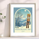 Poster from a wonderful ski resort holiday in the beautiful mountains of Powder Mountain, Eden, Utah! This small poster features an arch with a stunning blue-grey mountain landscape and retro ski boards in an orange tribal pattern in the foreground. The rest is in a lovely light blue tone with the location lettering in a modern font. The design is a lovely combination of retro and modern, and I hope you enjoy it!