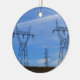 Photograph of 3 high voltage power line towers against blue sky near Fort Randall Dam, South Dakota.