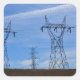 Photograph of 3 high voltage power line towers against blue sky near Fort Randall Dam, South Dakota.
