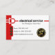 Cover features a creative white-red power plug line design that houses your business name "electrical service" which you can change. Just below this is your prestigious name. Contact details or captions are allocated in their respective gold electricity icon buttons. To the right is a gold "home letter-e circuit" logo you can use.