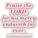 Thank you for buying these "Praise the Lord" stickers with classic red text. These stickers are inspired by the King James Version of 2 Chronicles 20:21, "Praise the LORD; for his mercy endureth for ever."