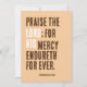 Praise The Lord - Thanksgiving Day Party - Invitation. This Bible Verse invitation is inspired by the King James Version of 2 Chronicles 20:21-22, "And when he had consulted with the people, he appointed singers unto the LORD, and that should praise the beauty of holiness, as they went out before the army, and to say, Praise the LORD; for his mercy endureth for ever. And when they began to sing and to praise, the LORD set ambushments against the children of Ammon, Moab, and mount Seir, which were come against Judah; and they were smitten." Add your favourite quote. Enjoy!