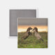 Magnet with two prancing wild Konik horses at sunset in the National Park Oostvaardersplassen in the Netherlands.