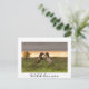 Postcard of two prancing wild Konik horses at sunset in the National Park Oostvaardersplassen in the Netherlands with a white border and the text: 'Wild horses'.