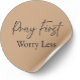 Minimalist Christian sticker featuring the faith reminder “Pray First, Worry Less” in a warm muted gold background.