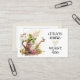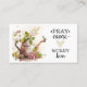 Business card depicts a nature watercolor art design with an adorable little bird sitting on a weathered watering can spout surrounded with garden flowers and leaves. It features Christian inspirational quote, "Pray more Worry less."