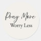 Minimalist Christian sticker featuring the phrase “Pray More Worry Less” — a simple and encouraging reminder to choose prayer over fear.