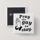 Square button on a white background with black text and illustration. The illustration is on the lower left and is of hands in prayer. On the right of the hands, in curved serif font, reads, "Pray the gay to stay."