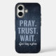 This phone case features a dark denim background with the inspirational christian quote "Pray Trust Wait. God has a plan."